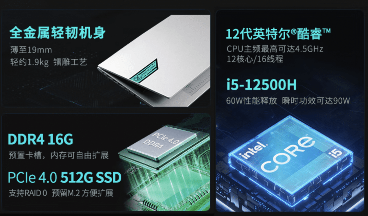核心配置上,玄智星系列提供了英特尔 i5-12500H 处理器,其采用了 4 大核 + 8 小核设计,最高 4.5GHz,拥有 18MB 三级缓存,支持 45W 性能释放。还包括 16GB 3200MHz DDR4 内存,预置卡槽,内存可自由扩展,512G SSD PCle 4.0 固态硬盘,同样预留 M.2 接口方便扩展。