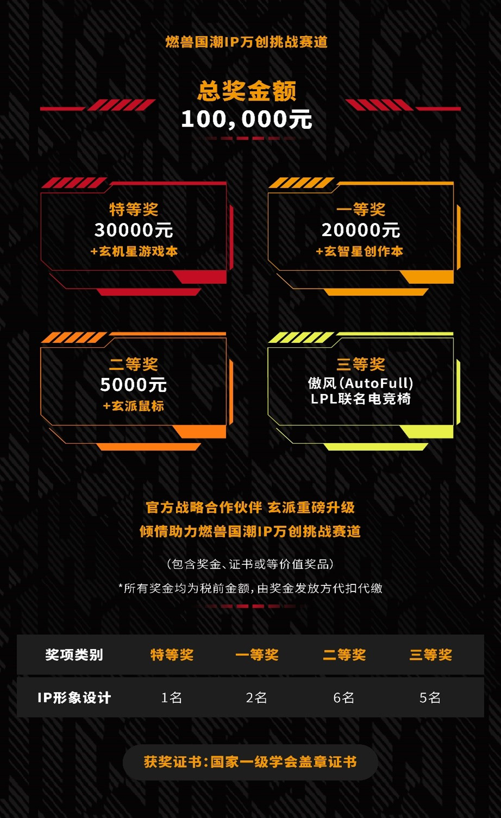 “燃兽国潮IP形象设计万创挑战赛道” 作为本届新增的原创设计赛道一经推出便引起广泛关注,本次玄派科技的加入更是为本赛道注入一波新鲜能量,为助力展现当代大学生的设计风采,奖池全面升级,本赛道优秀获奖者可获得奖金及玄派科技提供的丰厚奖品!