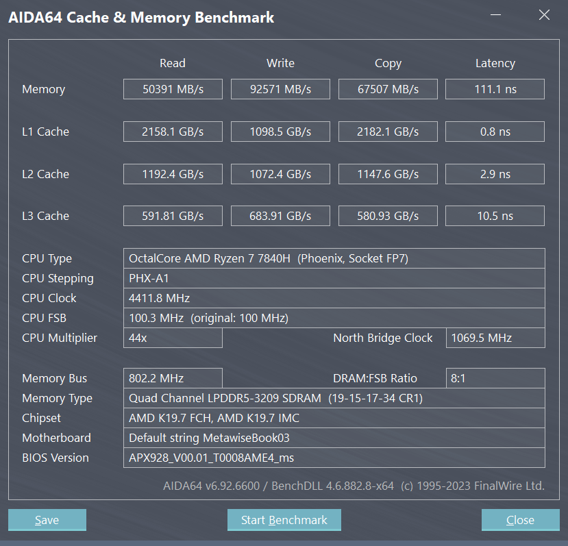 内存方面,AIDA64的内存测试,读取速度 50391MB/s,写入速度92571MB/s,时延111纳秒