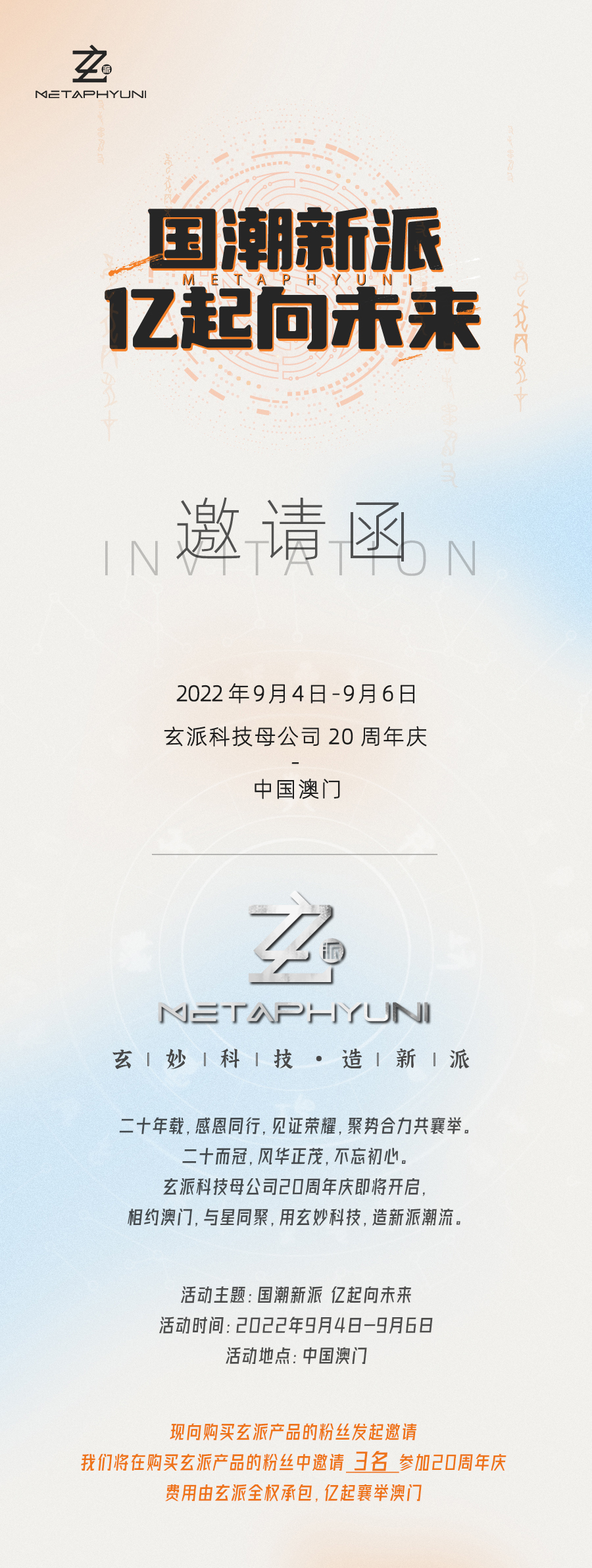 玄派科技母集团20周年庆即将开启,与星同聚,用玄妙科技,造新派潮流。襄举机会,玄派也想与粉丝一起感受,值此特向粉丝发起邀请,现购买过玄派产品的粉丝,将有机会参与20周年庆活动,你准备好了吗?